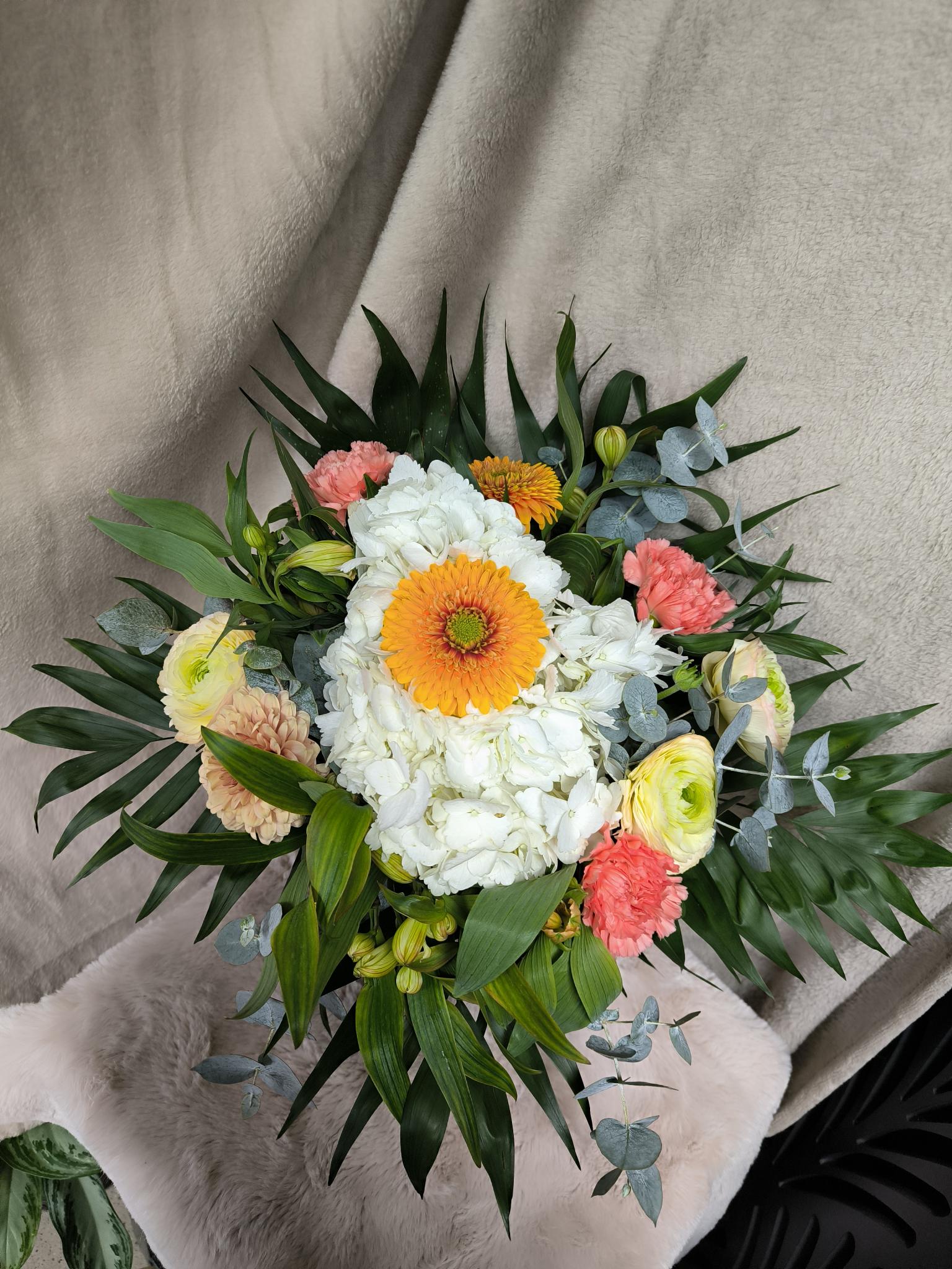 Composition : Fleurs aux tons orangés (roses, germinis, renoncules, dahlias ou équivalent selon saison) et feuillage naturel