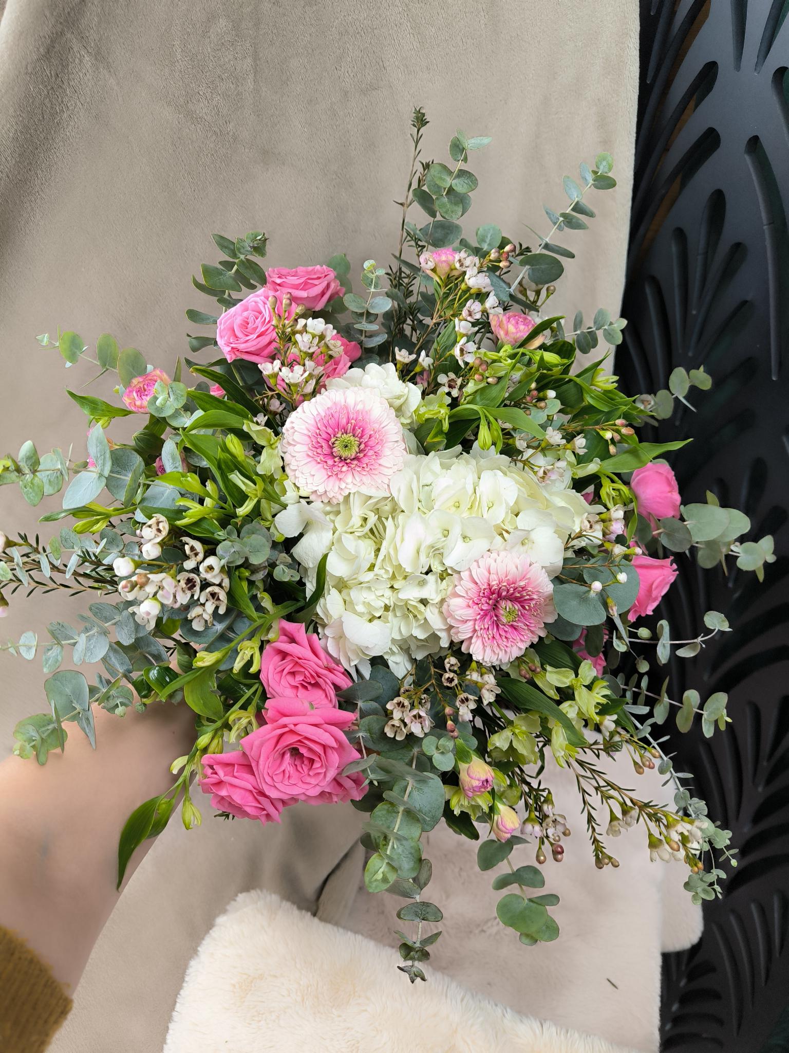 Composition : Fleurs roses variées (roses, renoncules, pivoines ou équivalent selon saison) et feuillage délicat
